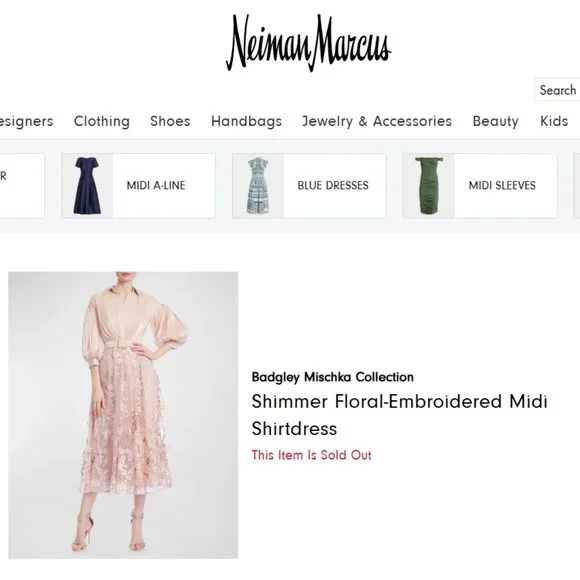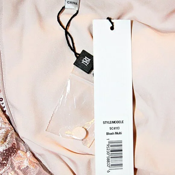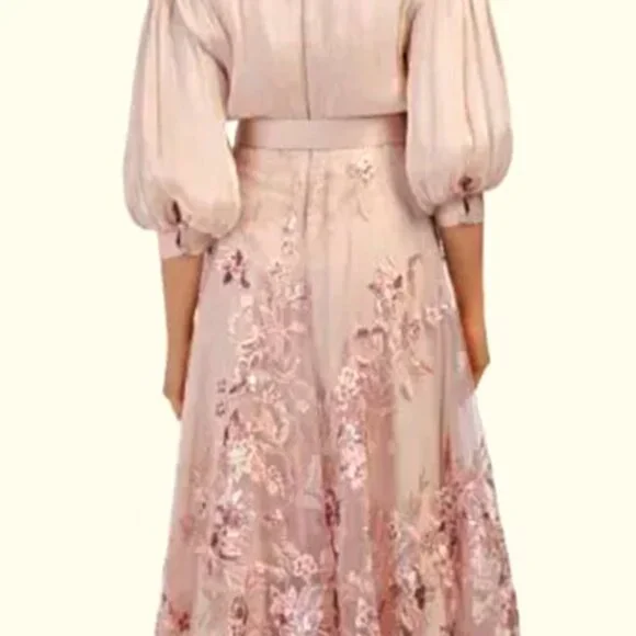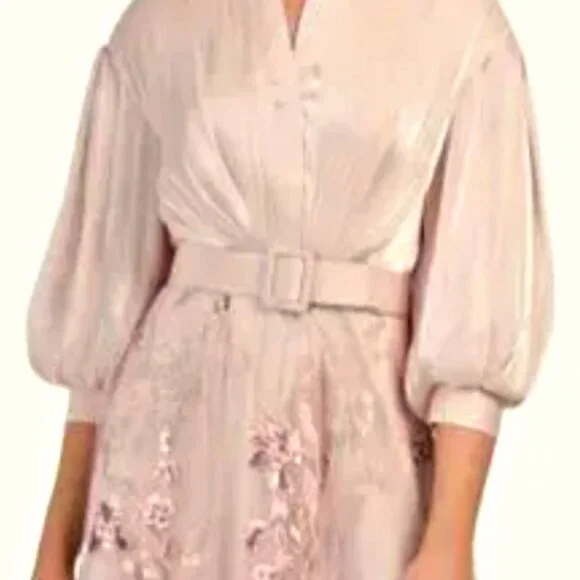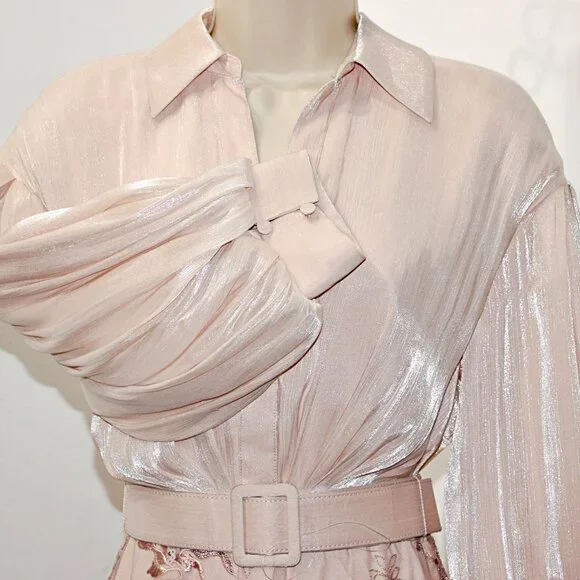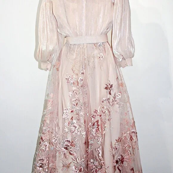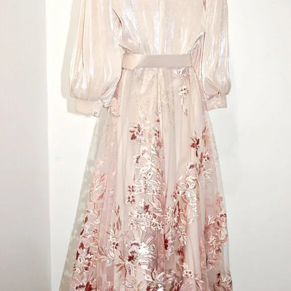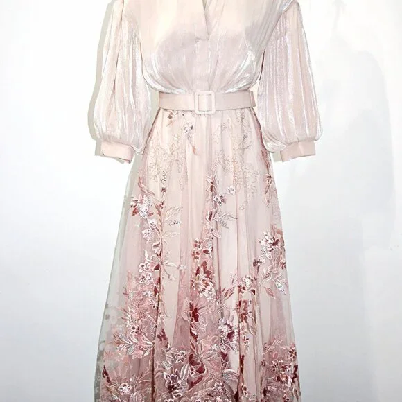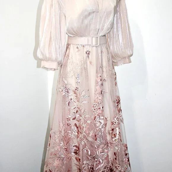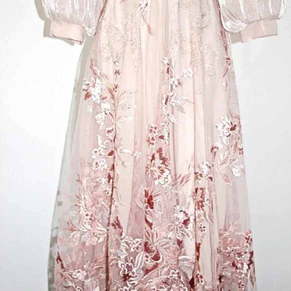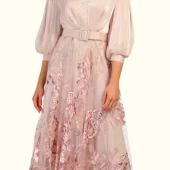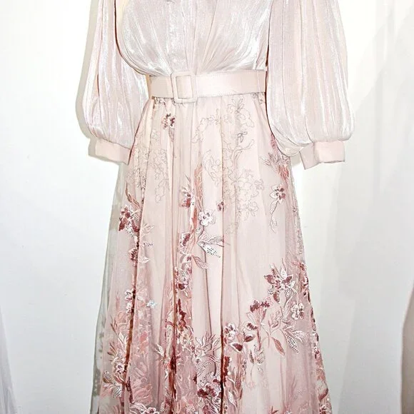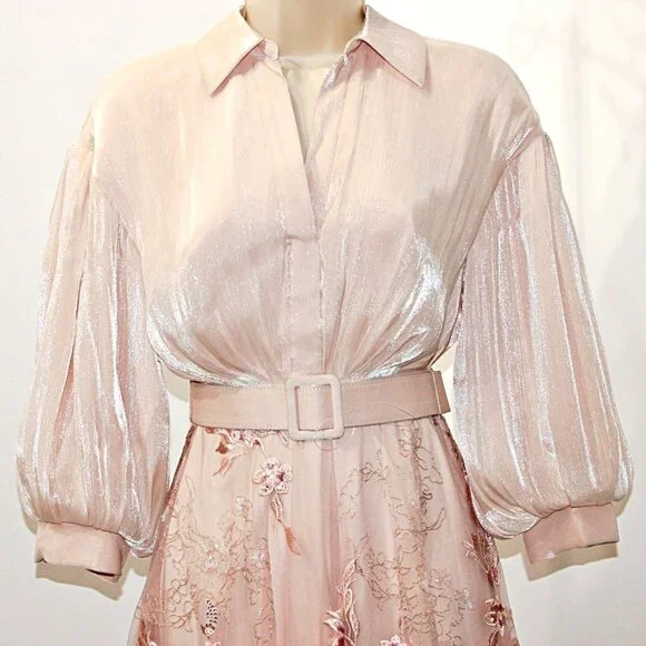 Badgley Mischka's elegant cocktailmidi shirtdress features a pleated shimmer satin bodice and a floral-embroidered tulle skirt, embellished with shimmering sequins.This romantic style is finished with a point collar, 3/4 blouson sleeves,dropped shoulders, and a belted waist. A-line silhouetteShirt dressSpread collar Split neck3/4 blouson sleevesButton cuffsDropped shoulders Ruched bodiceBelted waistFloral embroidered mesh overlay skirt with sequin accentsButton-front closure Back zip and hook closureThe hem falls below the kneeLined 100% polyesterColor:Blush Multi Spot clean Imported, China New with tag, never worn, flawlessOrig. $850Size4Approx. measurements laid flat and measured from side seam to side seam:Armpit to armpit: 17" - 18"Waist: 13"Hips:19"Shoulder to shoulder:almost 20" dropped shouldersSleeve length: 16"Full Length: 52" Due to variances in computer monitors and mobile screen settings as well asvarious settings for brightness and contrast, there may be a slight colordifferentiation between the color displayed on the pictures from the actualcolor of products for sale.Be sure this item fits you prior to bidding, it's easy . . . just compare the given measurements with the measurements of an item in your personal wardrobe.