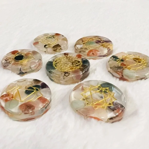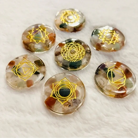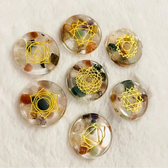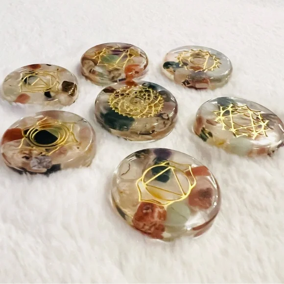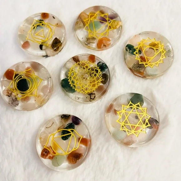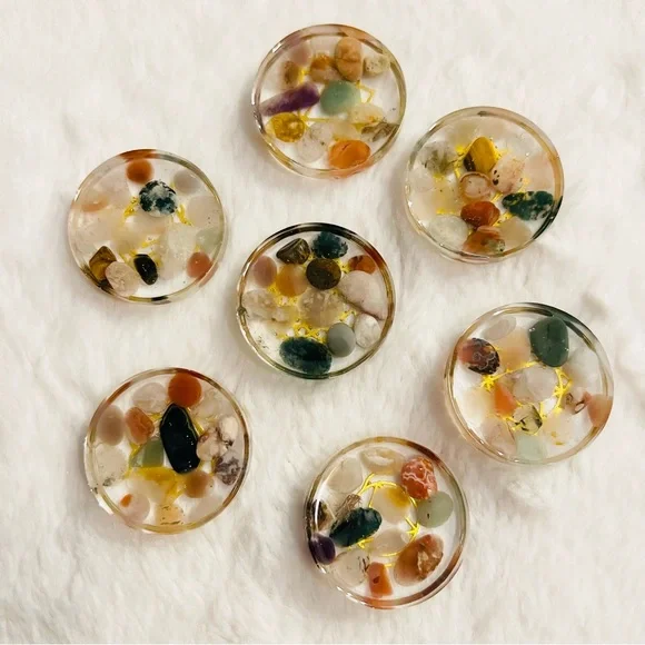 Healing Natural Stone Chakra Stones Meditation SetThis beautiful one of a kind meditation set includes 7 round chakra stones handcrafted with healing natural stones, clear resin, and gold tone acrylic paint. Each stone was individually selected and placed with positive intentions by me. These are cured and painted with patience and love. For use in your chakra meditations, home altars, or home decor. Durable resin is easy to clean and damage/chip resistant. Give the gift of intention for a positive path forward, focus and direction for those searching, and inner strength for health and growth! Perfect for birthdays graduations, new journeys, and more!Healing natural stones yoga meditation chakras altar watch witchy witchcraft pagan festival hippie edm gypsy travel party fun colorful boho bohemian gifting holiday housewarming home gift gift for her unique handmade one of a kind artsy resin art Mystical moon phase tapestry decoration goblincore mushrooms trippy