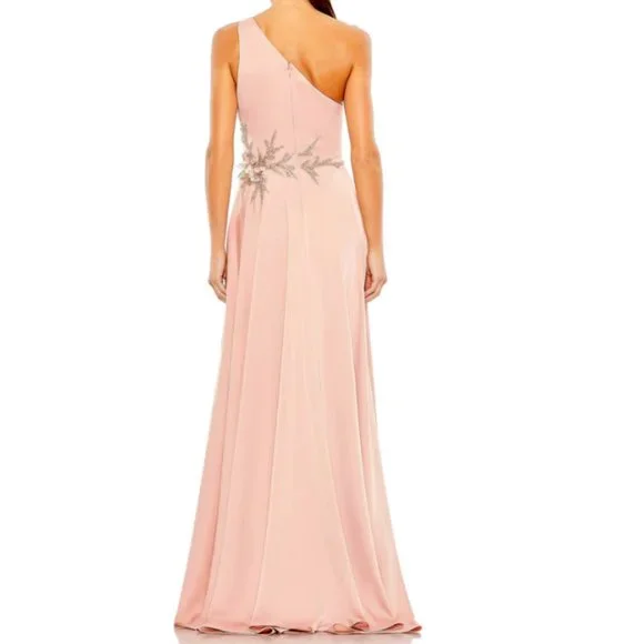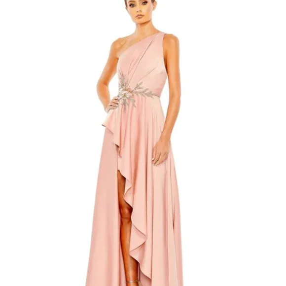 SIZE INFOTrue to size.DETAILS & CAREAn elegant one-shoulder satin gown dazzles with a gracefully gathered and beaded waist that flows into a cascading high-low hem.62 1/2" lengthOne-shoulder neckSleevelessLined100% polyesterSpot cleanImportedMac DuggalCharmeuse fabric (100% polyester) Fully lined though bodyAsymmetric one shoulder necklineSleevelessStatement waist detail composed of rhinestones, pearls, and 3D flowersAsymmetrical high-low hemConcealed back zipperApprox. 62.5" from top of shoulder to bottom hemAvailable in Rose (light pink)SIZE : 4NEW WITHOUT TAGSStyle #11262BUST: 35.5"WAIST: 27.5"HIPS: 38"